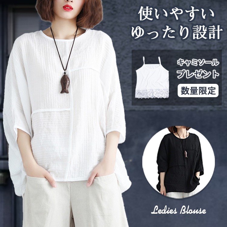 ブラウス 綿麻混 半袖 トップス リネン混 五分袖 無地 ワイド ゆったり 体型カバー 二の腕カバー