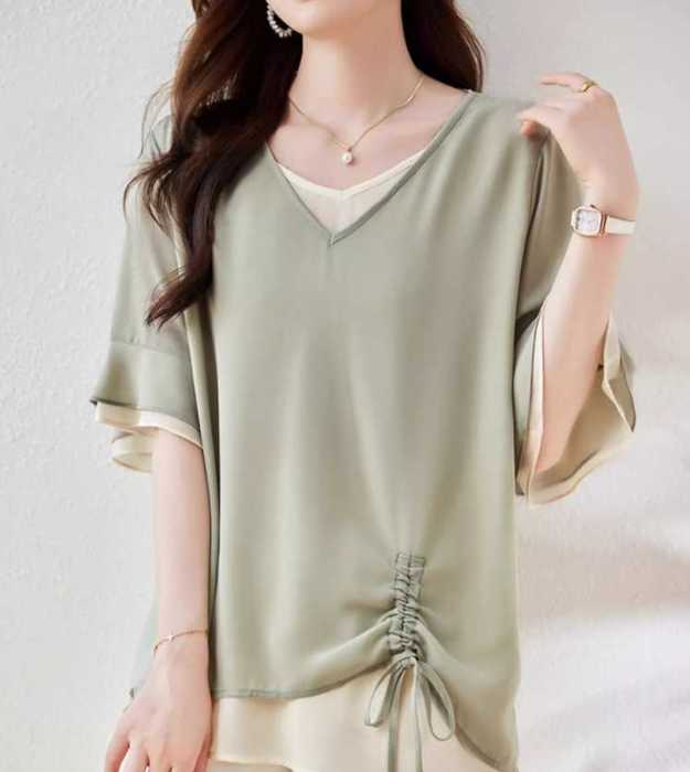 きれいめレディースファッション トップス 大きいサイズ M L XL 2XL 3XL 4XL 5XL フェイクツーピースシフォンシャツ ベルスリープ ブイネック 20代 30代 40代 50代 カジ