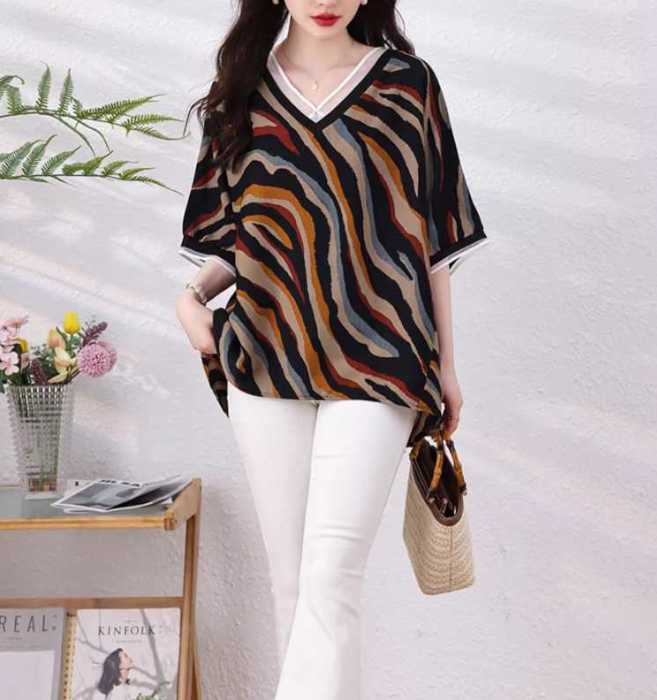 きれいめレディースファッション トップス 大きいサイズ L XL 2XL 3XL 4XL 5XL 不規則ストライプ柄 ブイネック フェイクツーピース 20代 30代 40代 50代 春 夏 秋 冬