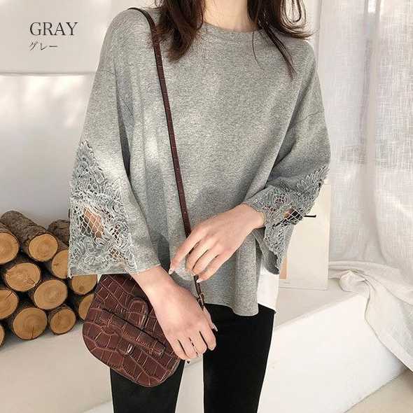 きれいめレディースファッション トップス 大きいサイズ M L XL 2XL 3XL 袖元レース コットンと異素材のTシャツ ラウンドネック 20代 30代 40代 50代 春 夏 秋 冬 シンプル