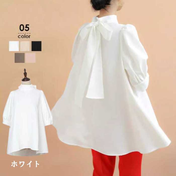 きれいめレディースファッション トップス ワンサイズ バックリボン シフォンシャツ スタンドカラー 20代 30代 40代 50代 カジュアル 春 夏 秋 冬 可愛い シンプル 大人シャツ ベージュ
