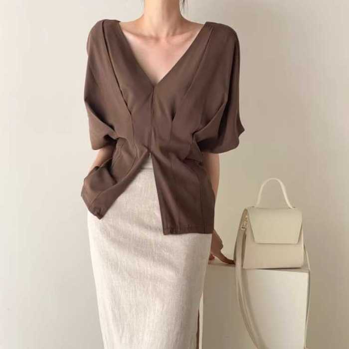 きれいめレディースファッション トップス ワンサイズ フロント バック両サイドのブイネックがおしゃれなシャツ 20代 30代 40代 50代 カジュアル 春 夏 秋 冬 シンプル ブラウン ホワイト