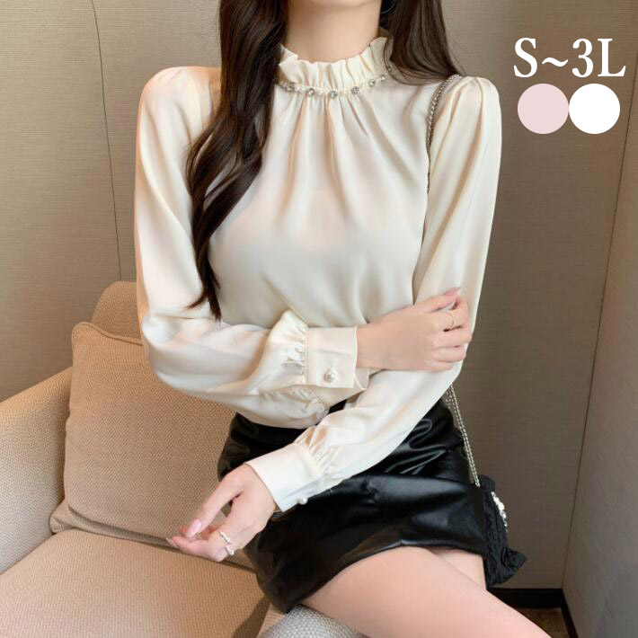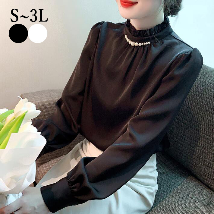 ブラウスレディース長袖パールバンドカラーハイネックフリルネックトップス重ね着透けおしゃれ春秋SML2L3L