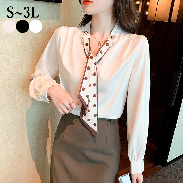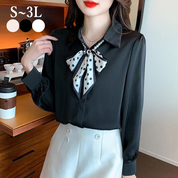ブラウス ボウタイ レディース オフィス フォーマルシャツシフォンドットパール 長袖フォマール通勤卒業式 卒園式 オフィス フェミニン大きいサイズきれいめ 秋 春 23