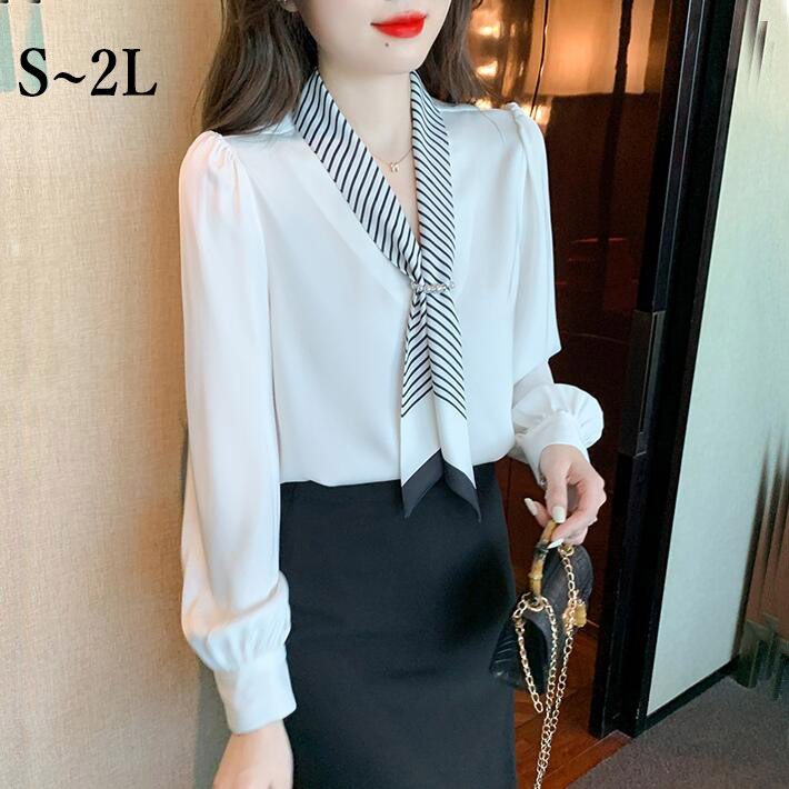 ブラウス レディースシャツ長袖 深ネックシフォントップスカジュアルフォマールオフィス通勤 シンプル大きいサイズ春秋 23
