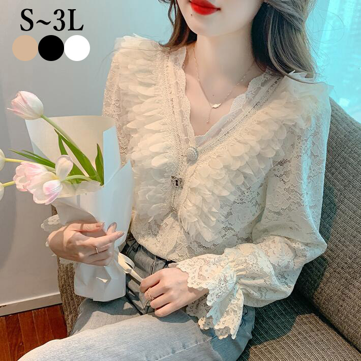 レース ブラウスレースブラウス花柄刺繍 フリルVネックトップス長袖 大きいサイズおしゃれ 可愛いレディース透け春秋S M L2L3L