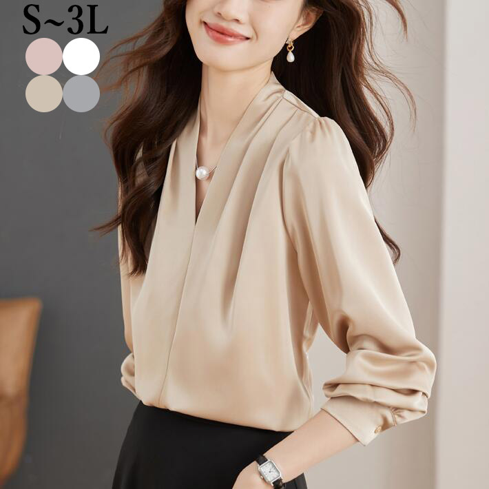 ブラウス レディース長袖 大きいサイズ 深VネックVネックギャザーシフォンシンプルトップスカジュアルフォマールオフィス通勤 おしゃれ ホワイト春S M L2L3L