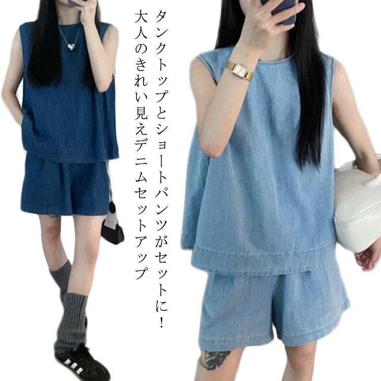 セットアップ デニム 夏 デニムシャツ デニムブラウス デニムシャツ デニムショートパンツ ノースリーブ