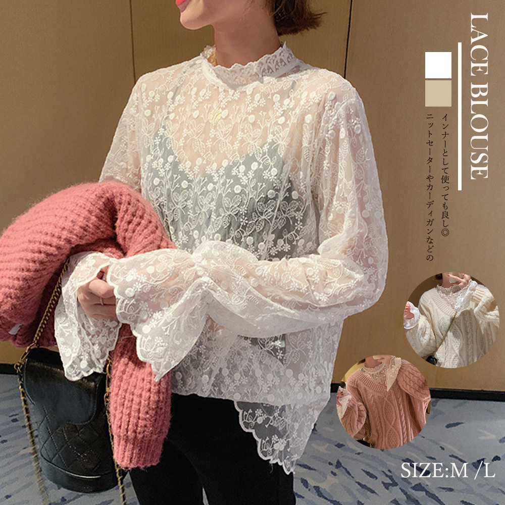 レースブラウス 長袖 レディース プチハイネック シアートップス シースルーレディースファッション トップス シャツ ブラウス