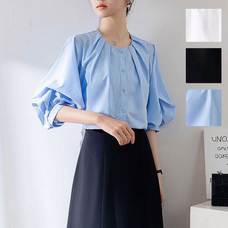 シャツ ブラウス パフスリーブ 5分袖 ボリュームスリーブ ギャザーネック トップス レディース 春 夏 通勤 無地 カジュアル 体型カバー フォーマル オフィス