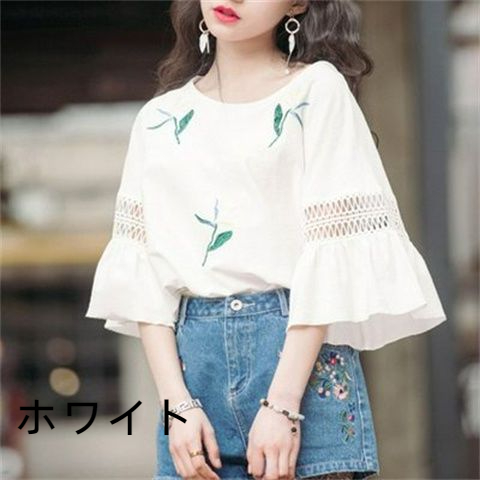 ブラウス トップス レディース フリル袖 ベルスリーブ 半袖 レース フラワー 夏 カジュアル チュニ ック 体型カバー