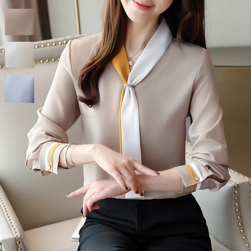 ブラウス ボウタイブラウス トップス レディース シフォン バイカラー 配色 シャツ 通勤 夏 秋 春 長袖 フォーマル リボン