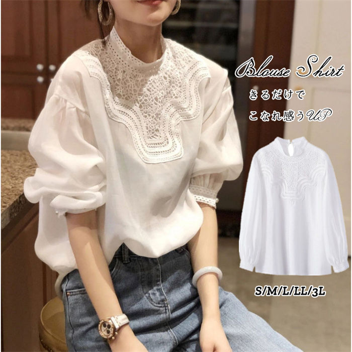 ブラウス チュニック レディース 長袖 ハイネック トップス 白シャツ レース シャツブラウス バルーン袖 カットソー インナー