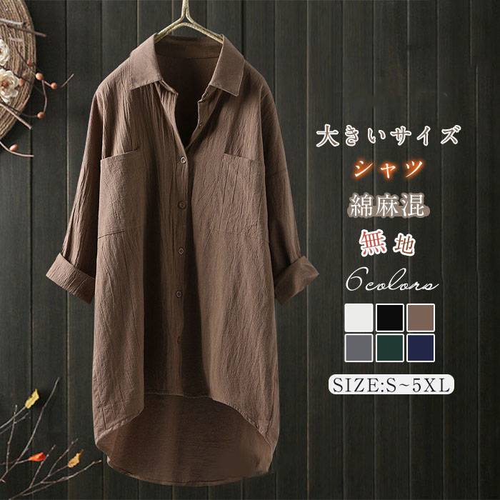 シャツ ブラウス レディース 長袖 ミドル丈 韓国風 綿麻混 ゆったり リネン長袖 スタンダードカラー シャツブラウス リネンシャツ 大きいサイズ オフィス