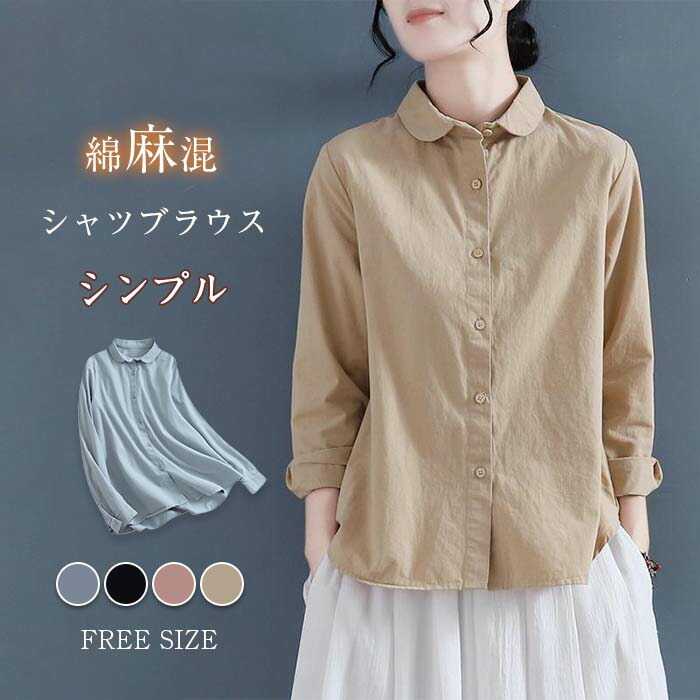 リネン シャツ ブラウス レディース 長袖 大きいサイズ 綿麻風 シャツブラウス 丸襟 シャツ ナチュラル カジュアル リネン コットンリネン トップス レディース 無地