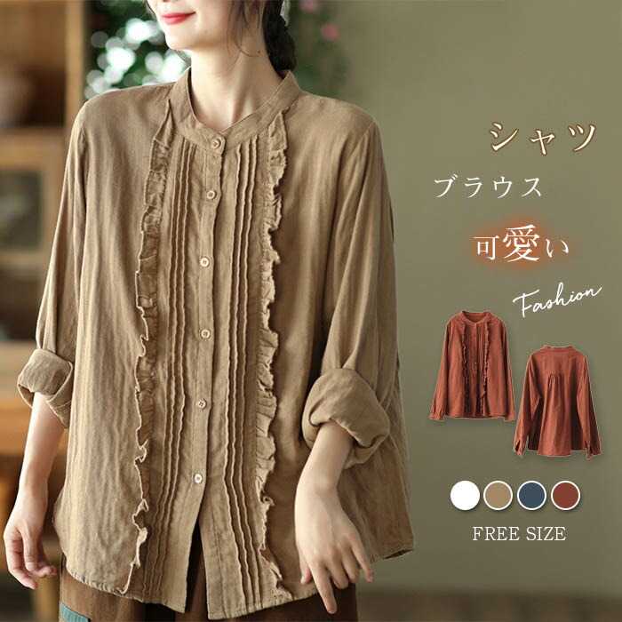 シャツ ブラウス レディース 長袖 かわいい 春 秋 冬 ギャザー コッント混 ブラウス 秋冬 ジョーゼット フリル きれいめ レトロ シャツブラウス 綿混