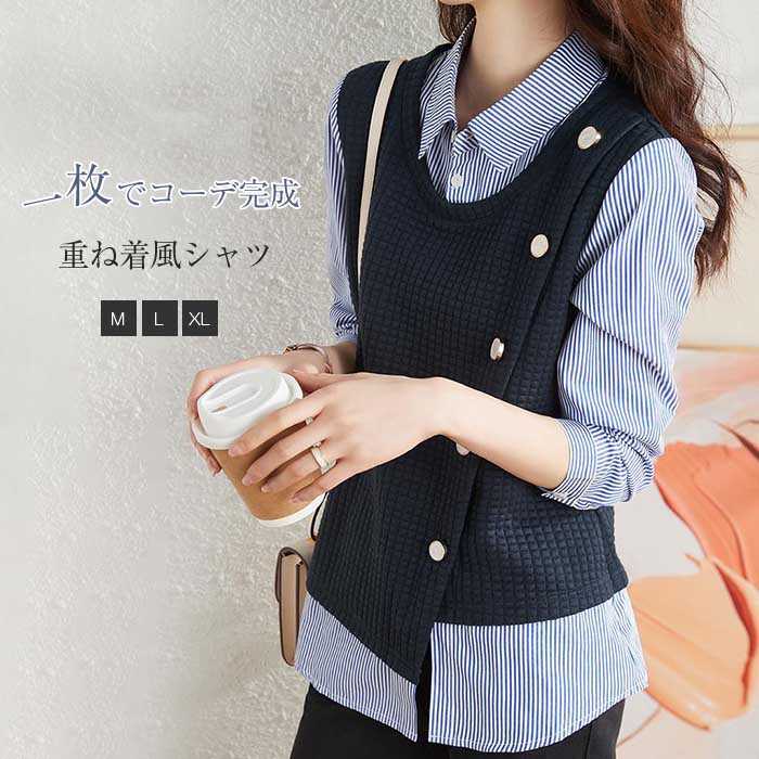 フェイクレイヤード シャツ ブラウス レディース 長袖 おしゃれ 秋 冬 春 ストライプ 異素材 トレーナー 切り替え ドッキング アシンメトリー きれいめ トップス