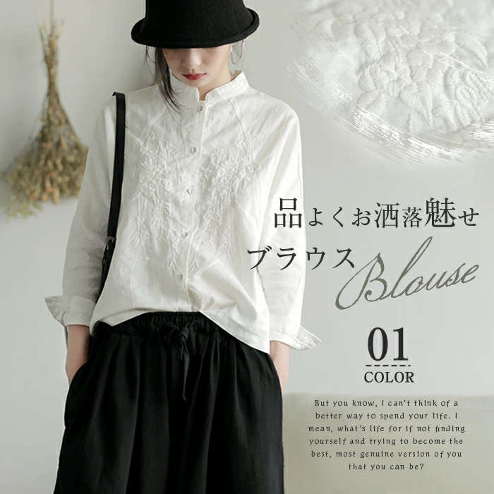 綿麻 シャツ レディース 長袖 ブラウス 秋冬 おしゃれ オフィス トップス 花柄刺繍 白シャツ お洒落 コットン リネン ゆったり きれいめ 体型カバー 刺繍付き 前開き 春秋 ショート丈 大人 通