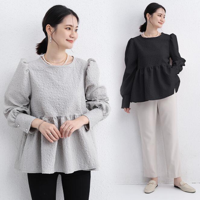 ブラウス レディース ジャガード 長袖 バルーン袖 パフ袖 エンボス 凸凹 膨れ バックリボン リボン ペプラム お洒落 フレア Uネック