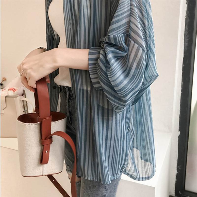 トップス レディース シャツ ブラウス 長袖 襟付き シフォン ストライプ 透け感 シースルー かわいい おしゃれ 大人 女子 こなれ感 ラフ キュート ルーズ カジュアル