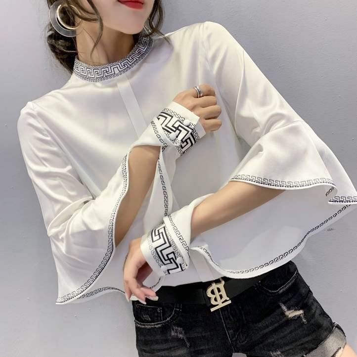 トップス レディース ブラウス チャイナ風 個性的 ワイド フレア袖 ボトルネック 無地 白 黒 S M L XL 2XL 3XL 大きいサイズ 春 夏 秋 上品 きれいめ おしゃれ シンプル