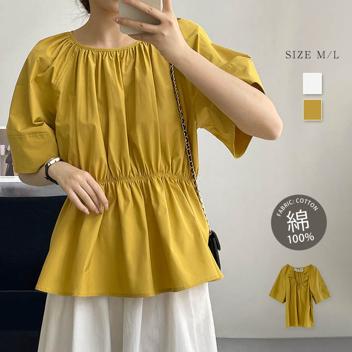 綿 半袖 シャツ レディース ブラウス 夏 5分袖 綿100% コットン ギャザー シャツブラウス レディースブラウス トップス フレア フレアブラウス