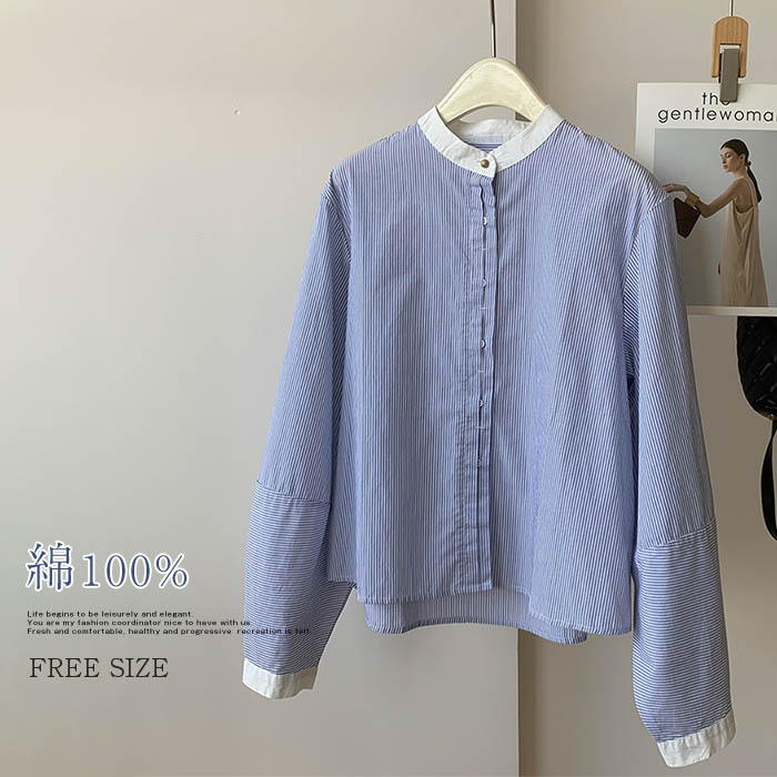 綿100% シャツ レディース ブラウス 夏 長袖 ストライプ コットン シャツブラウス 配色 トップス 大きサイズ 前開き 羽織り シンプル カジュアル 春夏 秋 冬 大人 体型カバー ゆったり