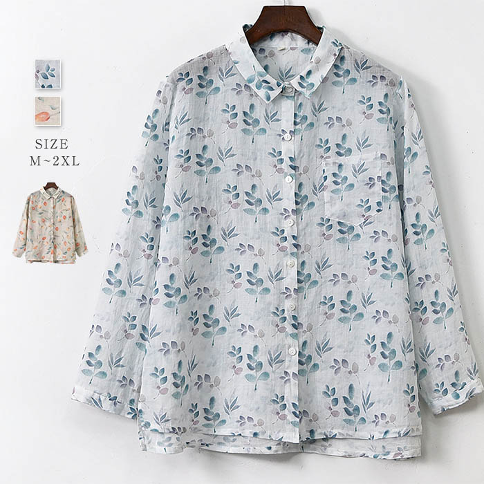 シャツ レディース ブラウス 夏 長袖 綿麻風 花柄 総柄 コットン リネン シャツブラウス 配色 トップス 大きサイズ 前開き 羽織り シンプル
