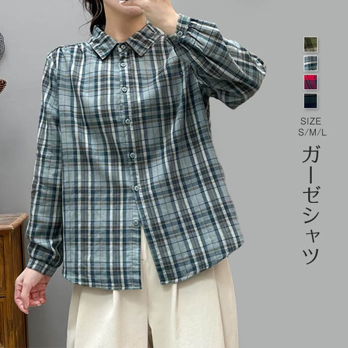 ガーゼシャツ コットン レディース 長袖 チェック ダブルガーゼ 春秋 トップス ダブルガーゼシャツ ガーゼシャツ レディースシャツ