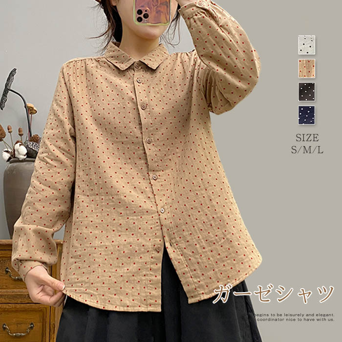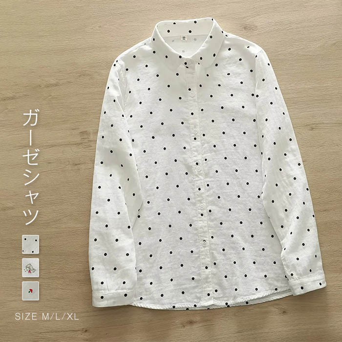 ガーゼ シャツ レディース 春秋 コットン 長袖 ドット 水玉 総柄 トップス コットン 2重ガーゼ レディースシャツ ダブルガーゼシャツ 綿 春 秋 シンプル シャツブラウス