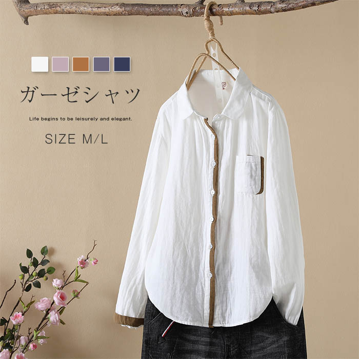 ガーゼ シャツ レディース 春秋 コットン 長袖 無地 トップス 配色 コットン 2重ガーゼ レディースシャツ ダブルガーゼシャツ 綿 春 秋