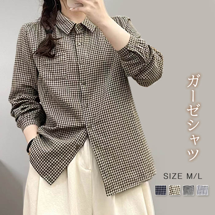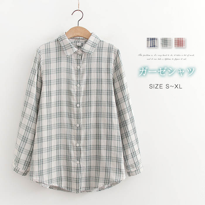 ガーゼシャツ コットン レディース 長袖 ダブルガーゼ 春秋 ギンガムチェック チェック トップス ダブルガーゼシャツ ガーゼシャツ レディースシャツ レディーストップス