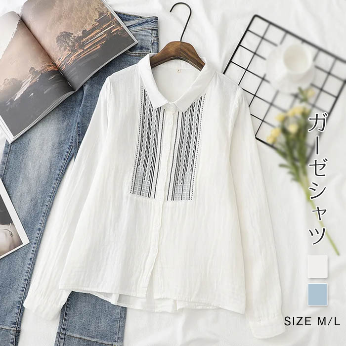 ガーゼ シャツ レディース 春秋 コットン 長袖 刺繍 トップス コットン 2重ガーゼ レディースシャツ ダブルガーゼシャツ 綿 春 秋 シンプル シャツブラウス