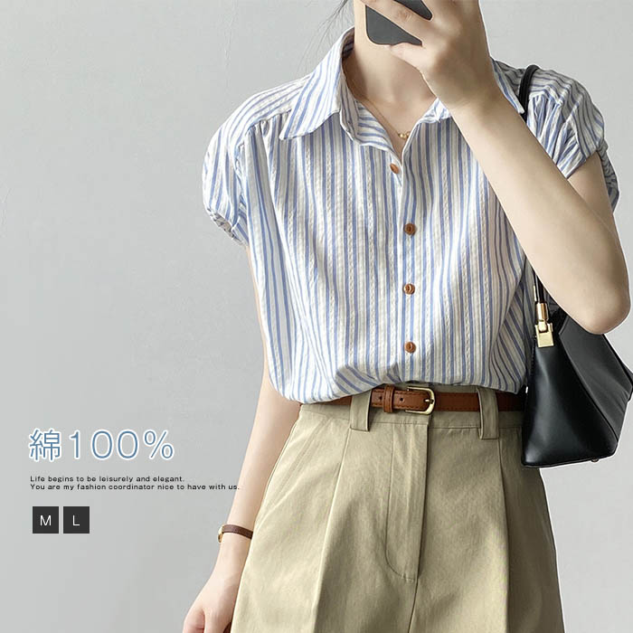 シャツブラウス レディース フレンチスリーブ 綿100% ブラウス オフィス ストライプ コットン 体型カバー 半袖 トップス