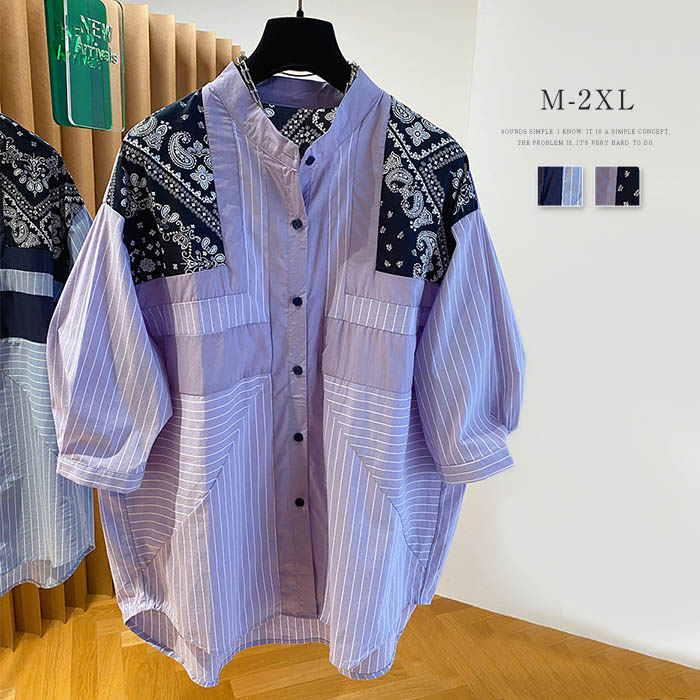 シャツ レディース 夏 パフスリーブ ブラウス オフィス ストライプ 体型カバー 5分袖 半袖 トップス スタンドカラー 定番 通勤 通学 配色 ゆったり