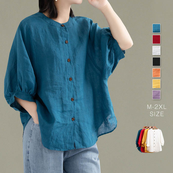 半袖 シャツ レディース ブラウス 夏 綿麻調 5分袖 シャツブラウス レディースブラウス トップス 前開き 羽織り シンプル カジュアル ナチュラル 春夏 大人 無地 コットン リネン