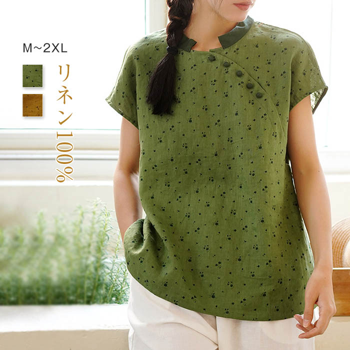 リネン ブラウス レディース 夏 リネン100% 半袖 切り替え 半袖シャツ ボタン スタンドカラー 麻 総柄 配色 トップス カジュアル おしゃれ 体型カバー