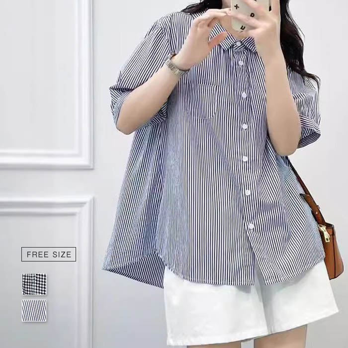 綿 シャツ レディース ブラウス 夏 半袖 5分袖 ギャザー チェック ストライプ シャツブラウス レディースブラウス