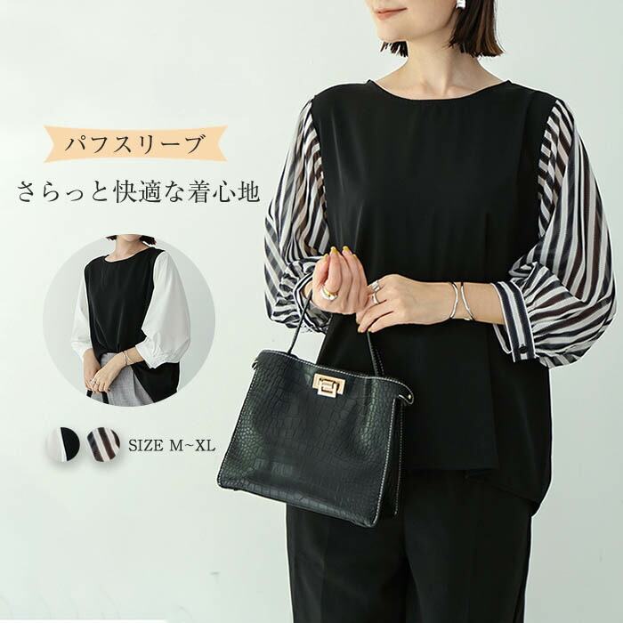 ブラウス レディース 春夏秋 七分袖 トップス レディーストップス レディースブラウス 春 夏 秋 クールネック キレイめ パフ袖 パフスリーブ 無地