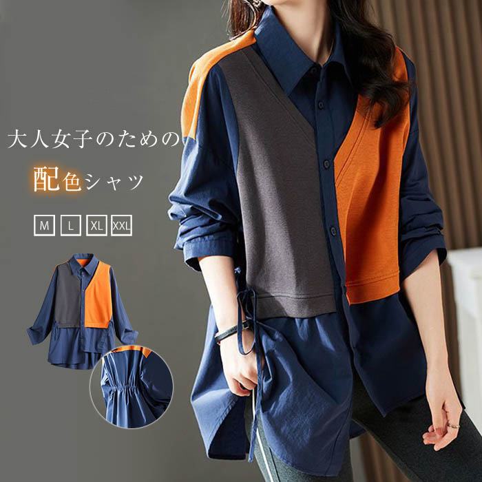 トップス シャツ レディース シャツブラウス 長袖 長袖シャツ 長袖トップス コットン 綿 春 秋 春秋 カジュアル 配色 ドッキング 通勤 通学 日常 ディリー