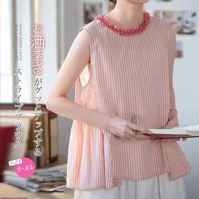 ブラウス 夏 レディース ノースリーブ ストライプ ブラウス レディース トップス ストライプ フリル 可愛い 夏ブラウス 柄 大人 上品 着回し 個性 森ガール カジュアル ピンク