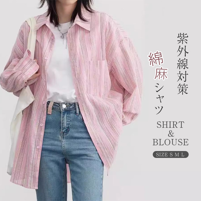 リネン シャツ 羽織り ブラウス 長袖 レディース 春夏 カット 紫外線対策 前開き ゆったり かわいい 大きいサイズ ゆる ストライプ 麻 シャツブラウス カジュアル トップス