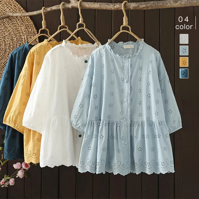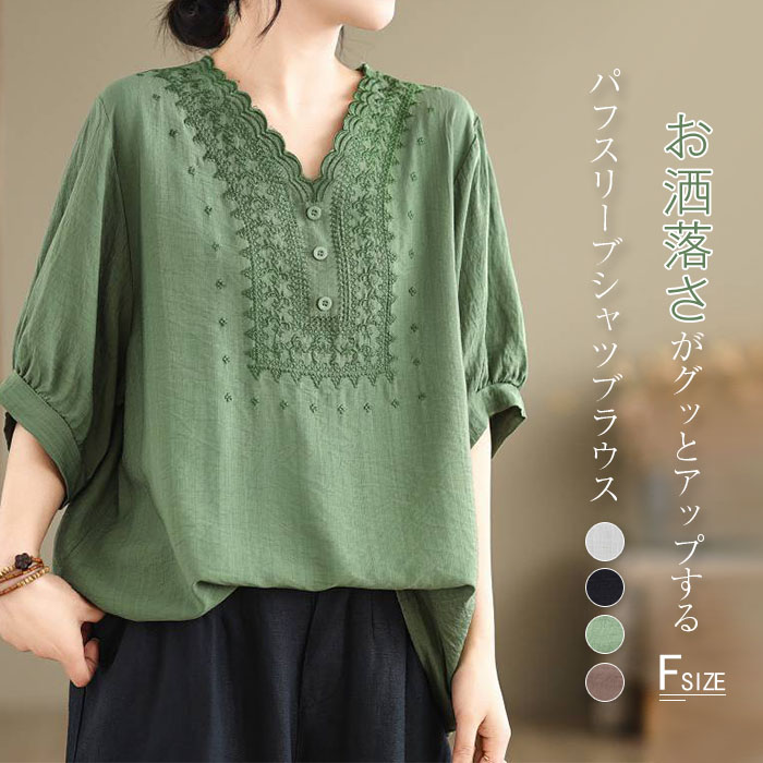 シャツ ブラウス 夏 綿 レディース 5分袖 シャツブラウス レディースブラウス トップス 刺繍 花柄ブラウス 半袖 シャツ カジュアル