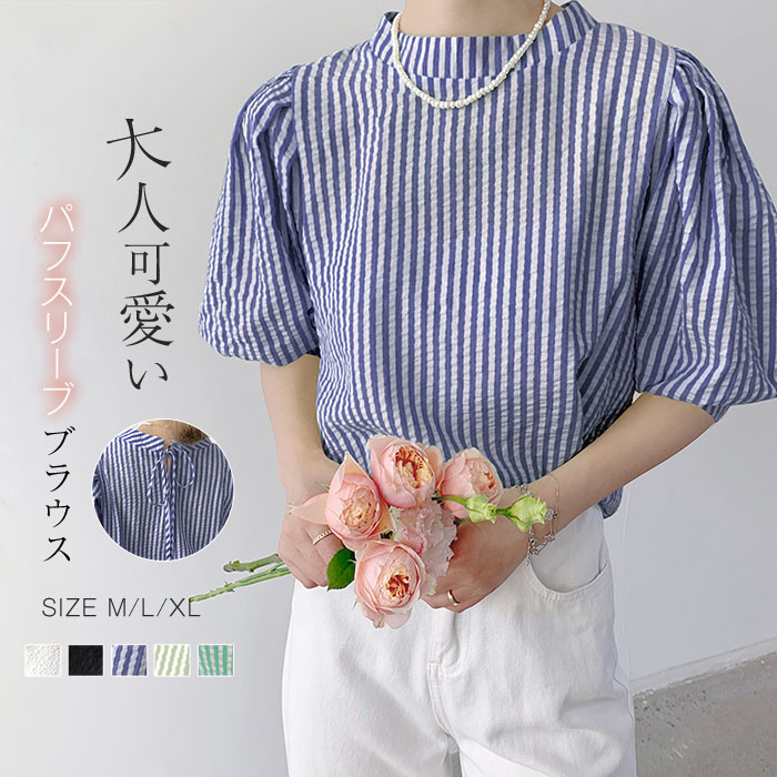 シャツブラウス レディース パフスリーブ ブラウス オフィス ストライプ 体型カバー 5分袖 トップス 定番 通勤 通学 配色 ゆったり