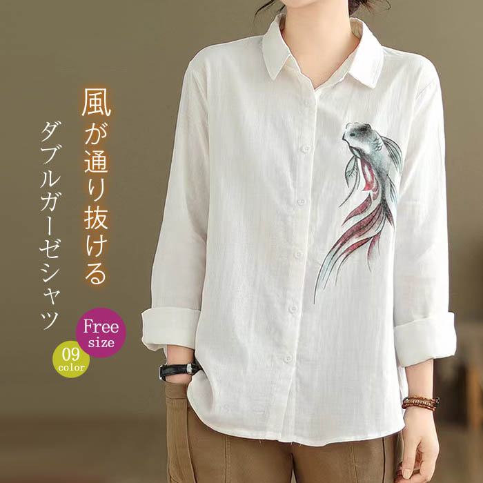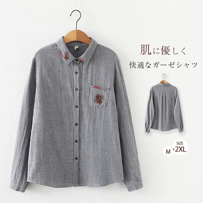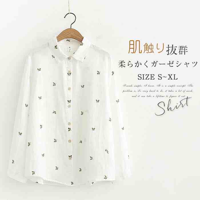 ガーゼシャツ レディース シャツブラウス 長袖 ガーゼ 長袖シャツ 柄シャツ トップス コットン 綿 春 秋 春秋 カジュアル 柄 刺繍 ナチュラル