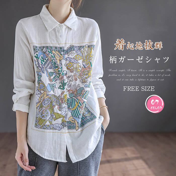 ガーゼシャツ レディース シャツブラウス 長袖 ガーゼ 長袖シャツ 総柄シャツ トップス 長袖トップス コットン 綿 春 秋 春秋 カジュアル 柄 総柄 ナチュラル