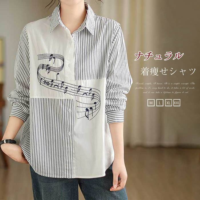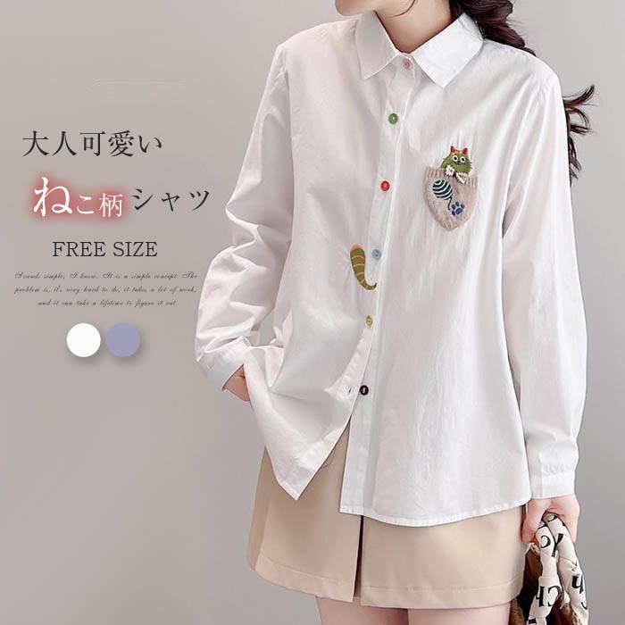 大人可愛い シャツ ねこ柄 春秋 コットン レディース 長袖 可愛い トップス レディースシャツ シャツブラウス 刺繍シャツ 長袖シャツ 羽織り ストライプシャツ