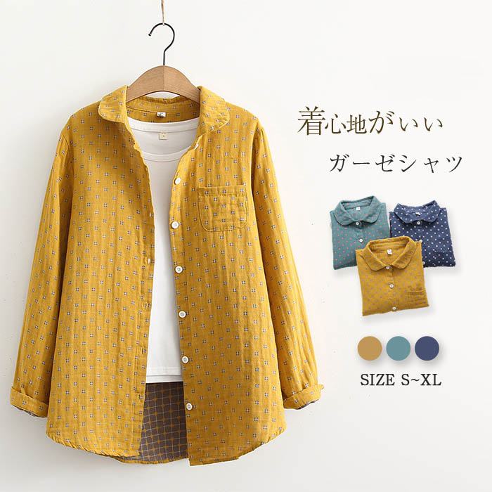 ダブルガーゼ シャツ 長袖 柄 2重ガーゼ レディースシャツ シャツブラウス レディース トップス 春 夏 秋 冬 オールシーズン ガーゼ 羽織り コットン