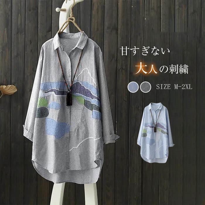 シャツ レディース レディースシャツ トップス 長袖シャツ 長袖トップス 春 秋 夏 春夏秋 ロングシャツ ロング丈 カジュアル 刺繍 ストライプ
