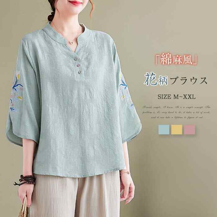 ブラウス レディース 7分袖 コットン リネン 春 夏 春夏 花刺繍 シャツブラウス レディースブラウス トップス 柄 がら 柄ブラウス 薄手 花柄刺繍 綿 麻 柔らかい 20代 30代 40代 50